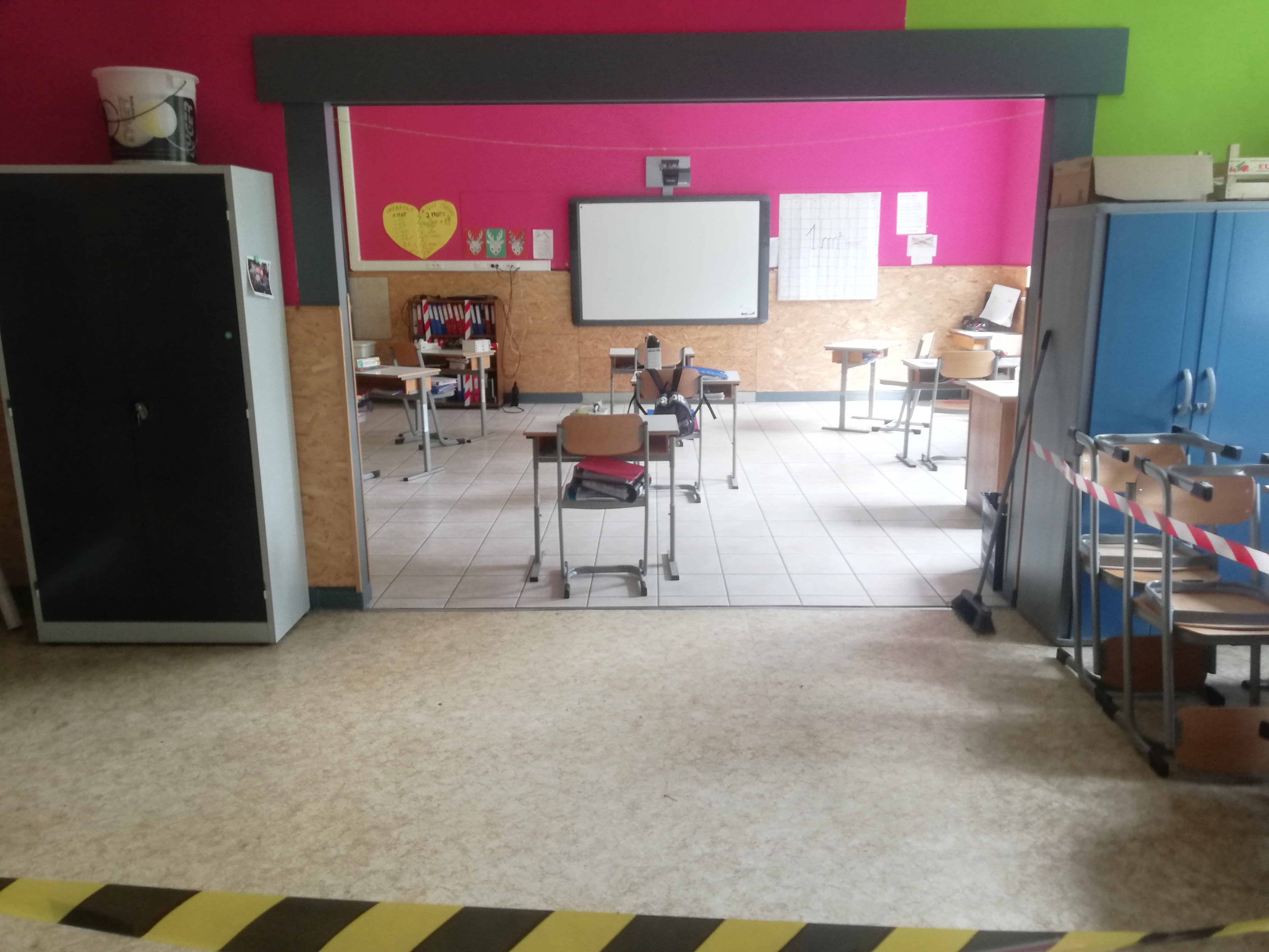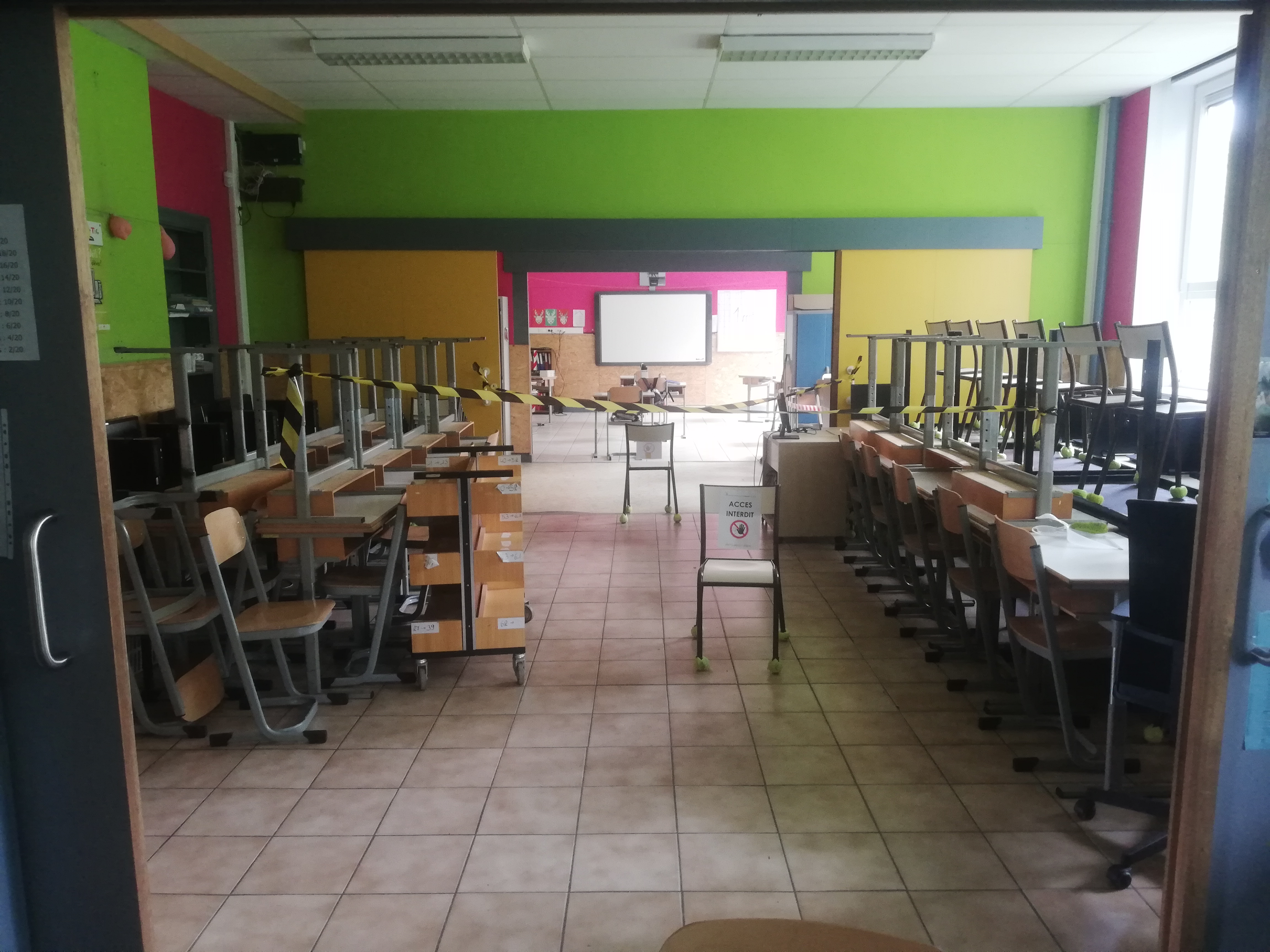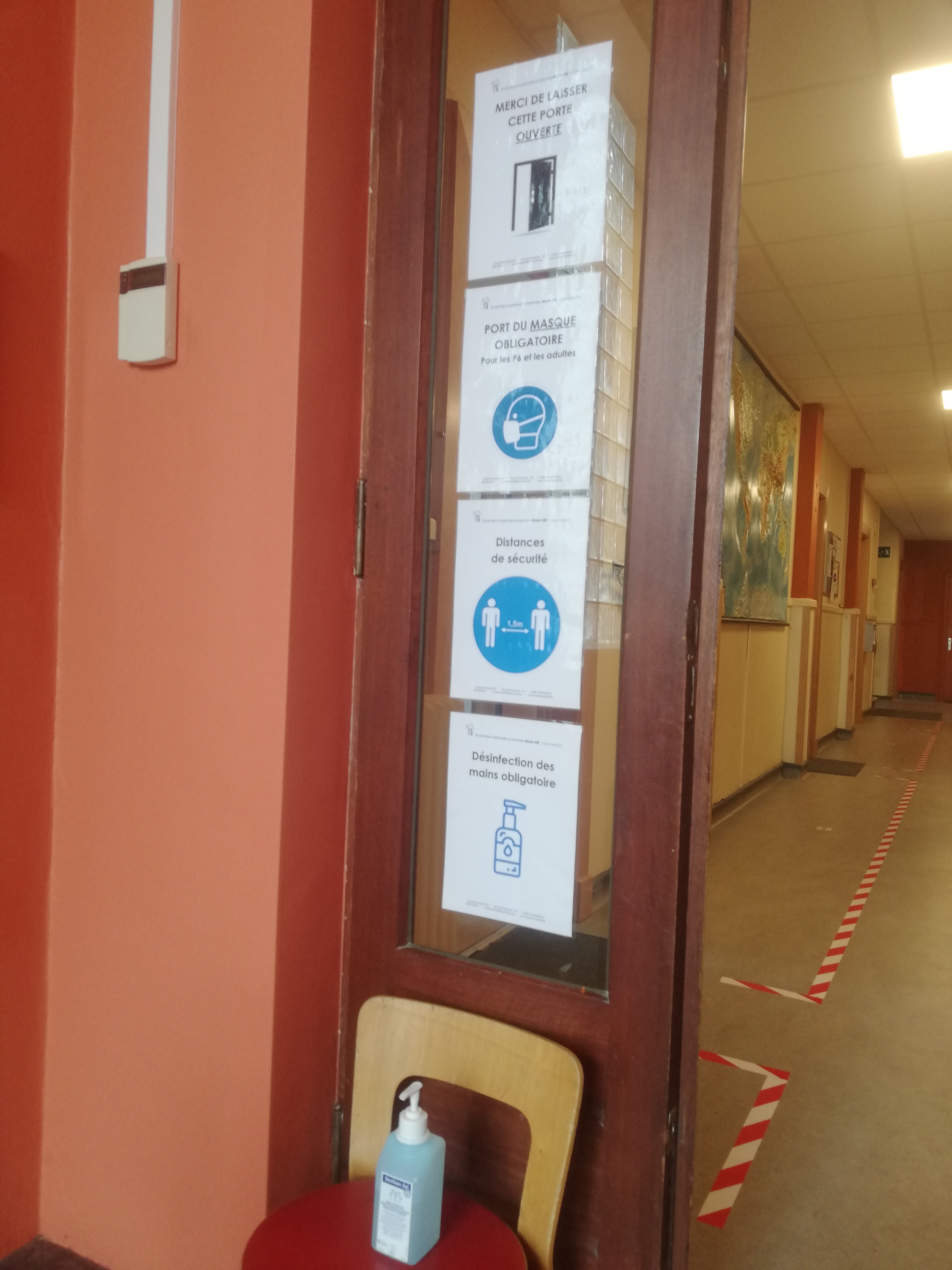 Réaménagement des classes aux normes 4m²/enfant et 8m²/adulte, pictogrammes de sécurité et consignes affichées partout !