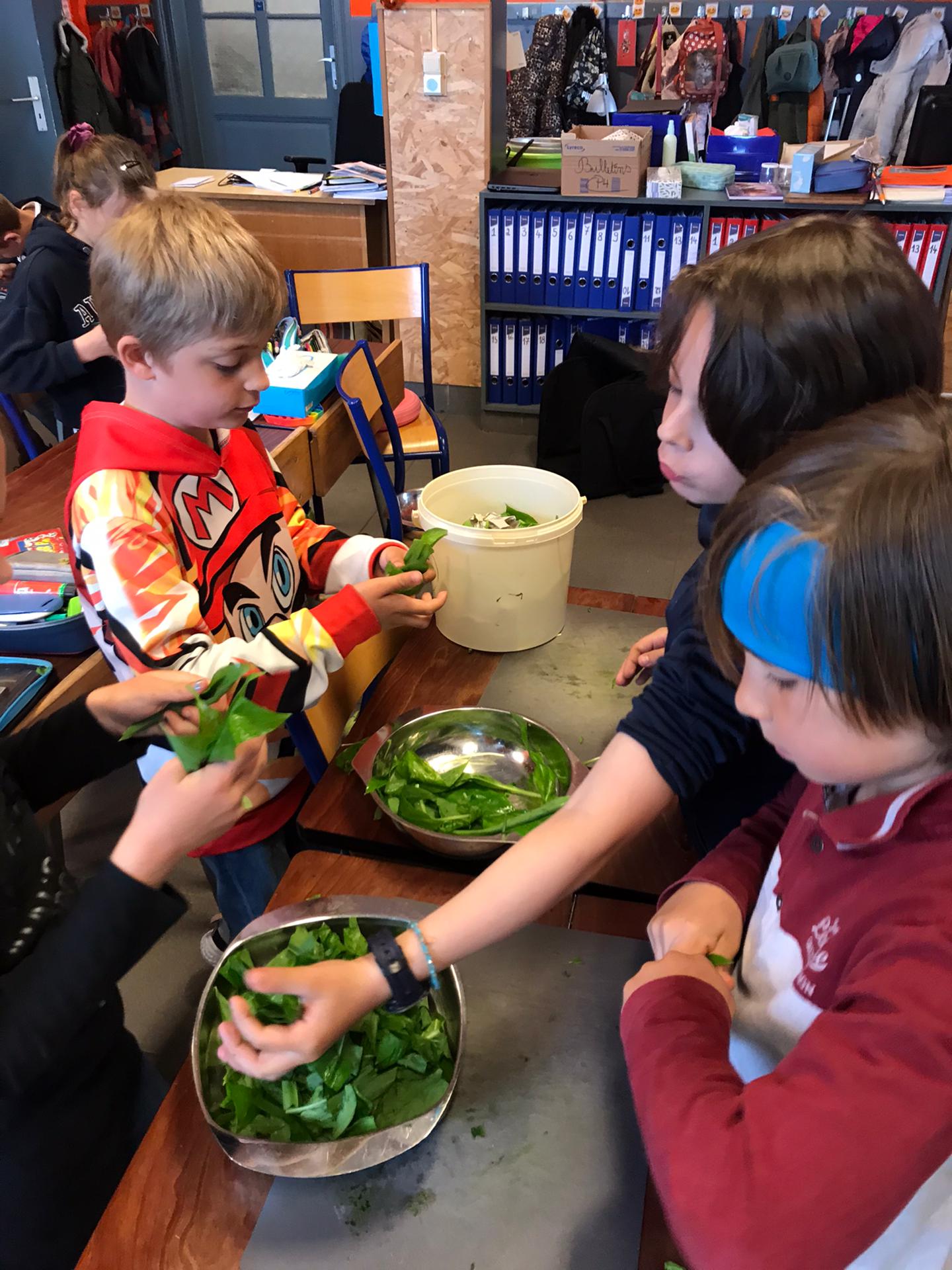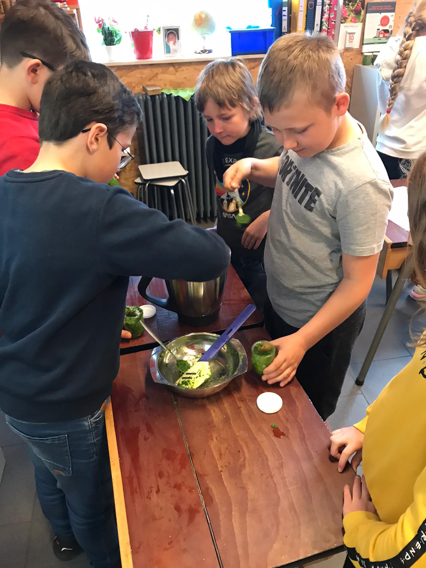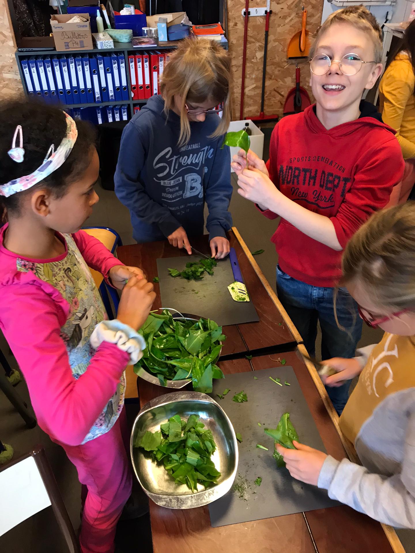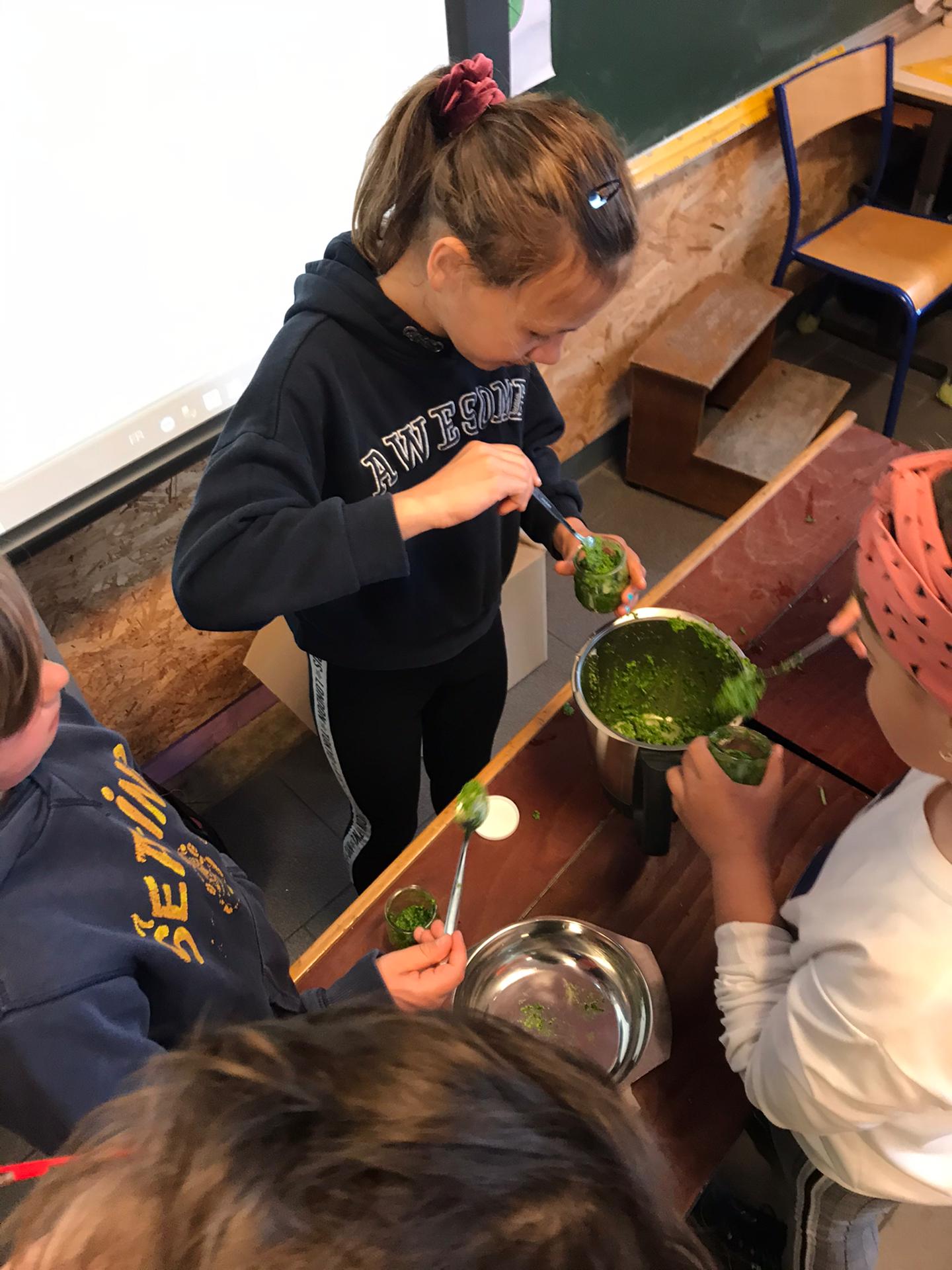Les élèves de P3 et P4 profitent de ce que la nature nous offre pour cuisiner un délicieux pesto à l’ail des ours pour la fête des mamans !