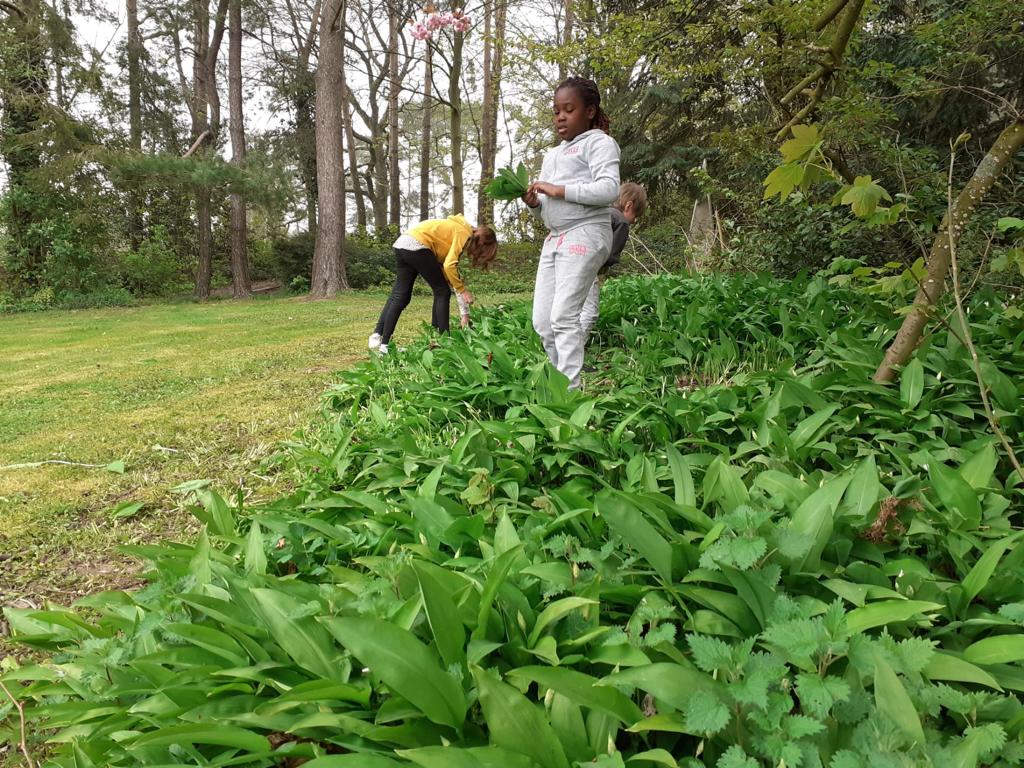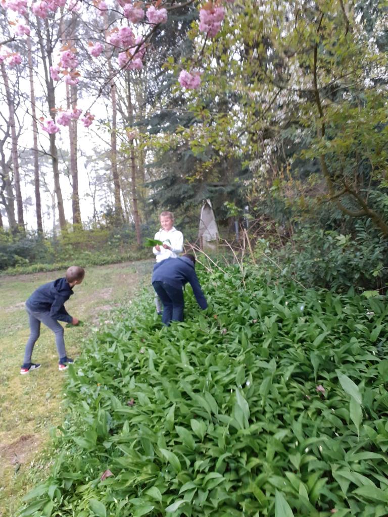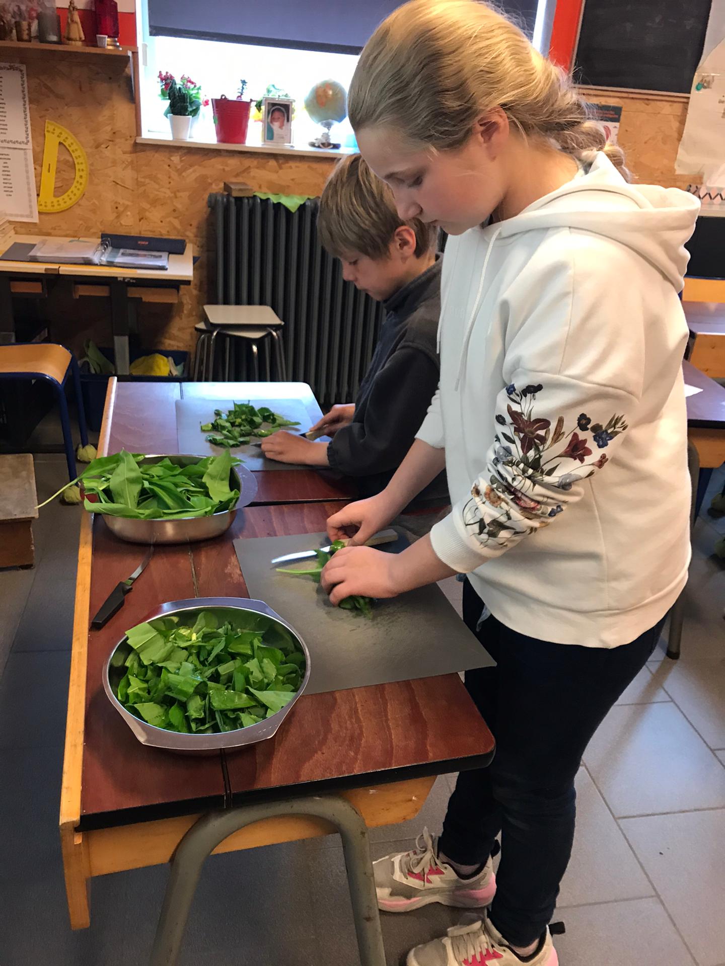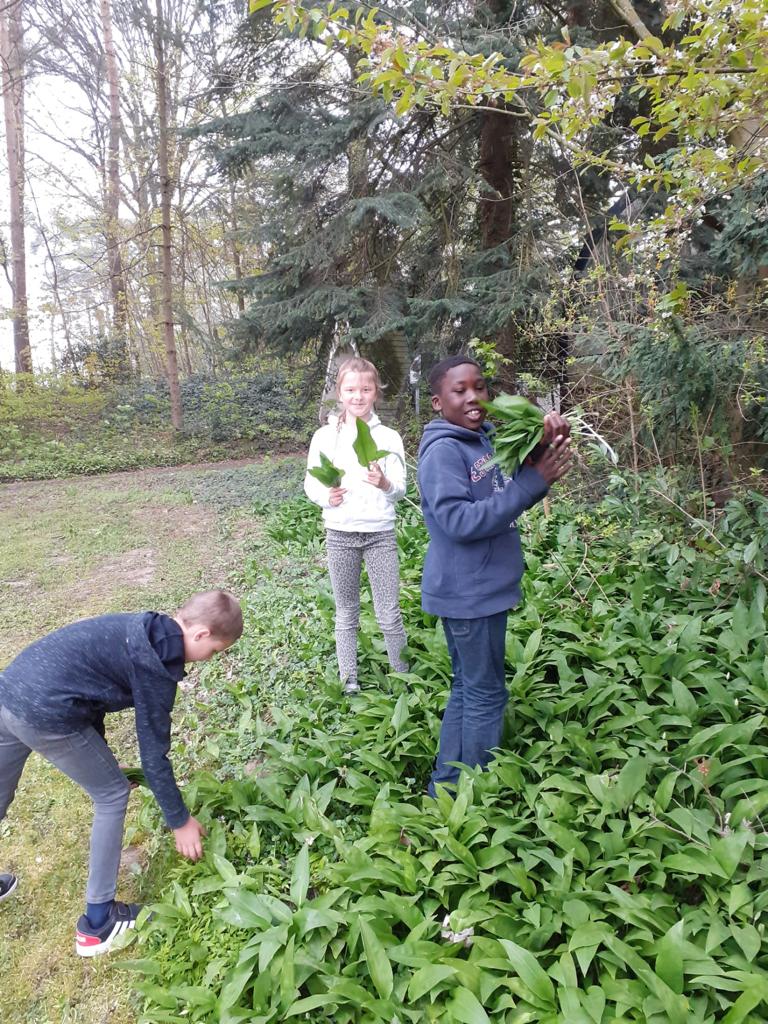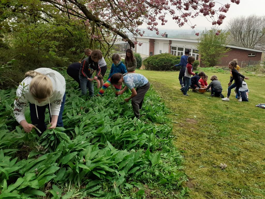 Les élèves de P3 et P4 profitent de ce que la nature nous offre pour cuisiner un délicieux pesto à l’ail des ours pour la fête des mamans !