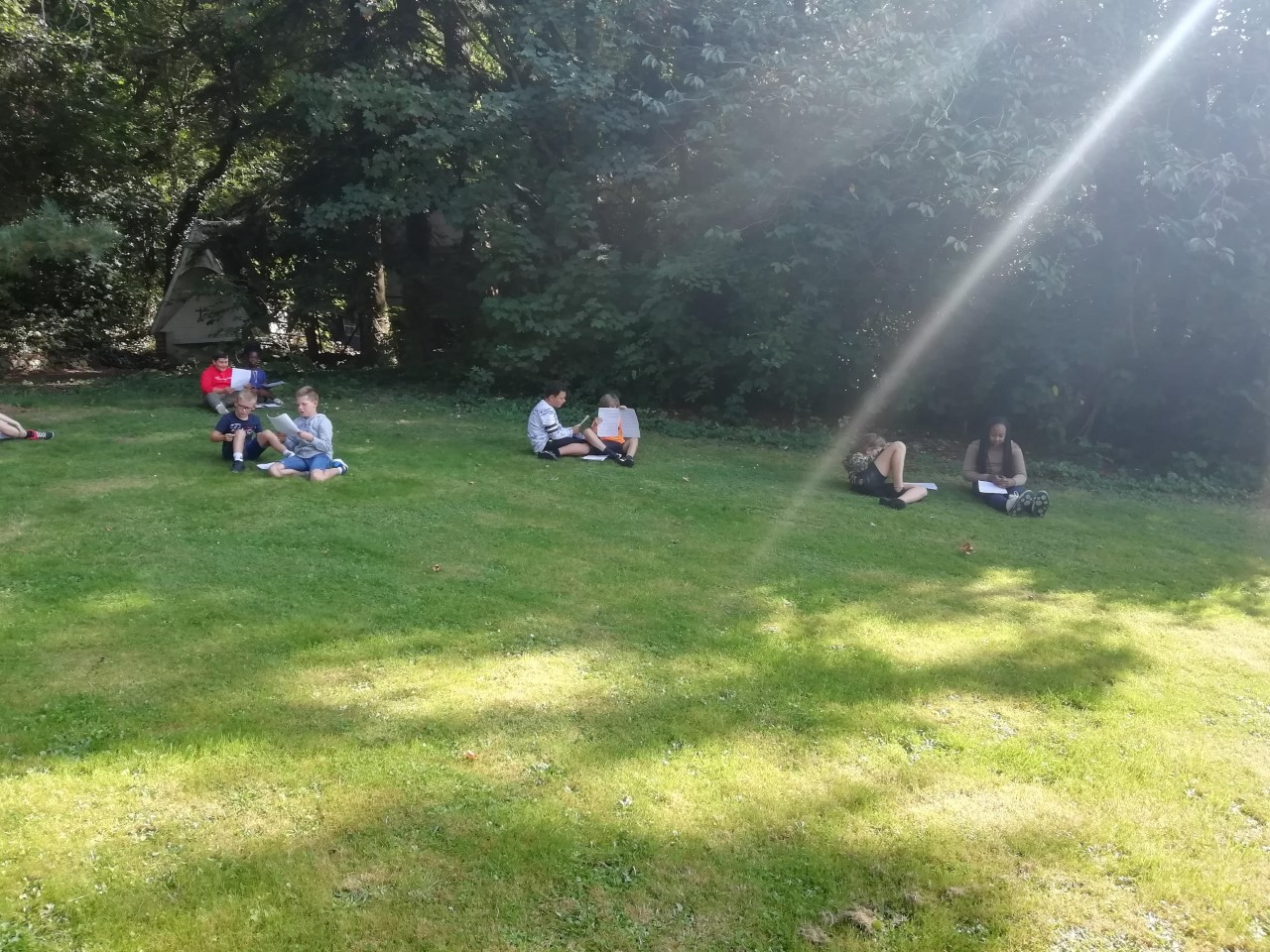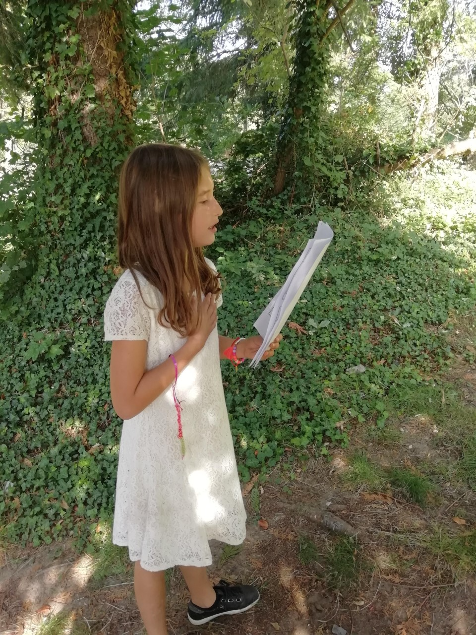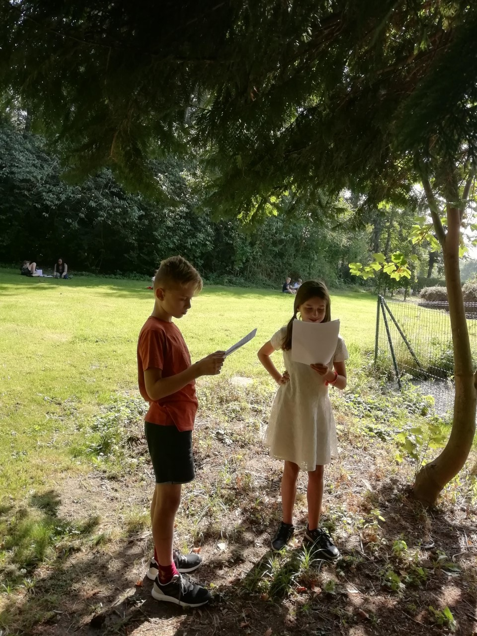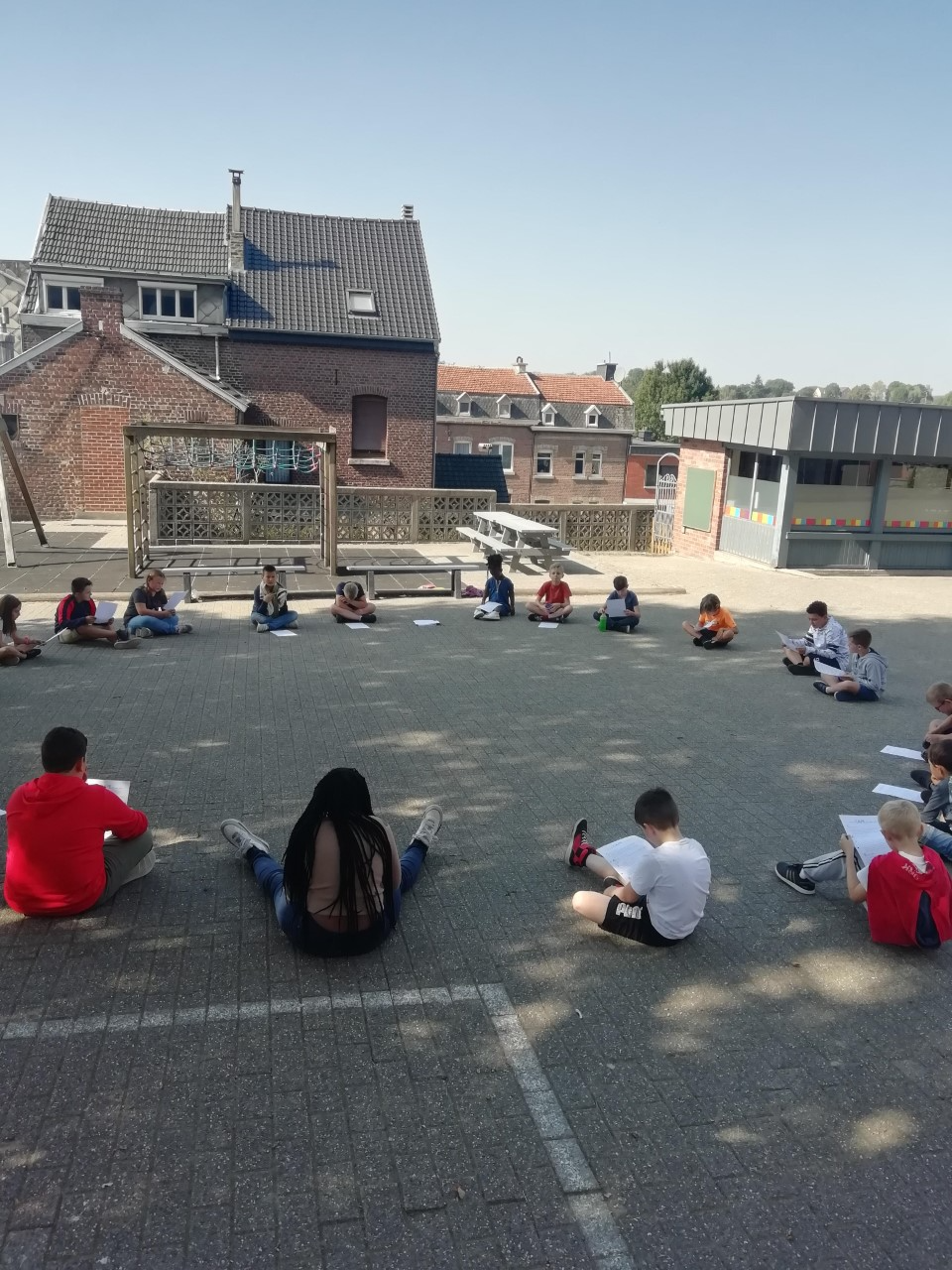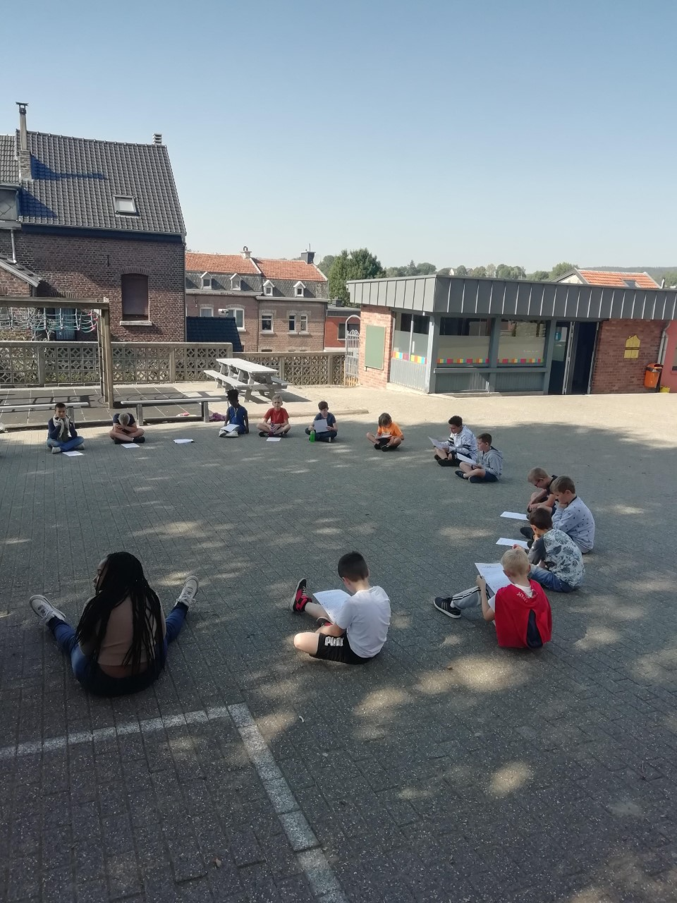 Amusés, réticents, fâchés, angoissés, dans la peau d’un enfant, d’une personnage âgée, d’un robot, d’un homme politique… les enfants de P5 se sont entraînés à lire avec de l’intonation et de l’expression. Dans leur équipe, à l’autre de deviner le personnage ou l’adjectif choisi par le lecteur. Mais aussi des jeux pour entraîner le débit, le volume, la respiration, la ponctuation… Tout un programme, sous le soleil et dans le magnifique cadre de verdure que nous offre notre école.